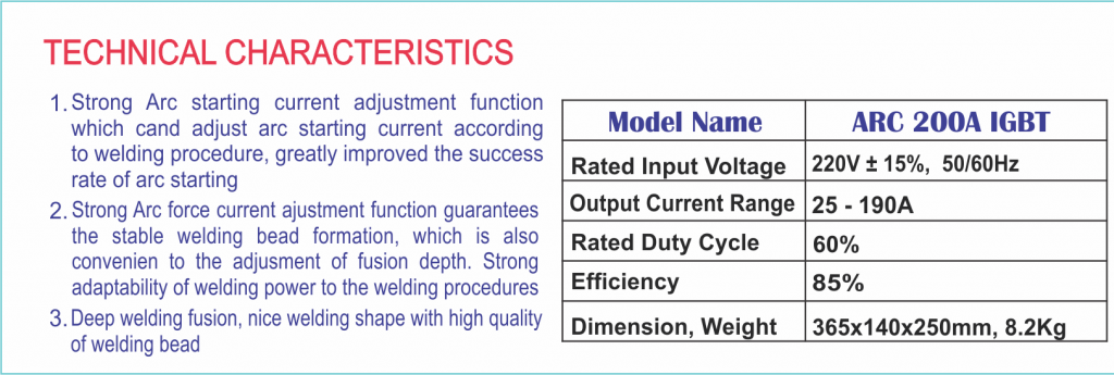 Equipped with Insulated Gate Bipol Transistor (IGBT) technology, the ARC-200A offers high efficiency and consistent welding performance. This technology allows for better control over the welding process and reduces power consumption.
